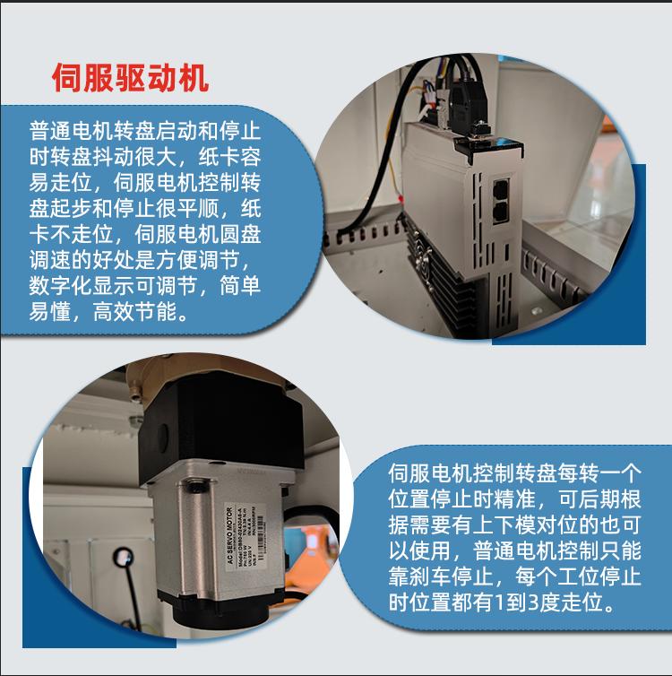 ②伺服電機(jī)控制轉(zhuǎn)盤,模具邊上可以放一疊紙卡,方便工人能快速放進(jìn)模具,大大提高生產(chǎn)效率。普通電機(jī)控制的轉(zhuǎn)盤,模具邊如果放紙卡就會(huì)把紙卡沖走轉(zhuǎn)位。