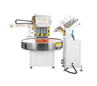 ①操作簡便:只要設置好延時時間、加熱時間、冷卻時間及加熱電流轉換檔位,圓盤就會自動旋轉。人工放產品及吸塑,圓盤轉動到放紙卡的機械手位置,機械手自動放紙卡,然后圓盤自動轉動到壓板下,機器的延時系統、加熱系統及冷卻系統便會自動操作,壓好產品后,自動轉到取料機械手位置,機械手取出產品;